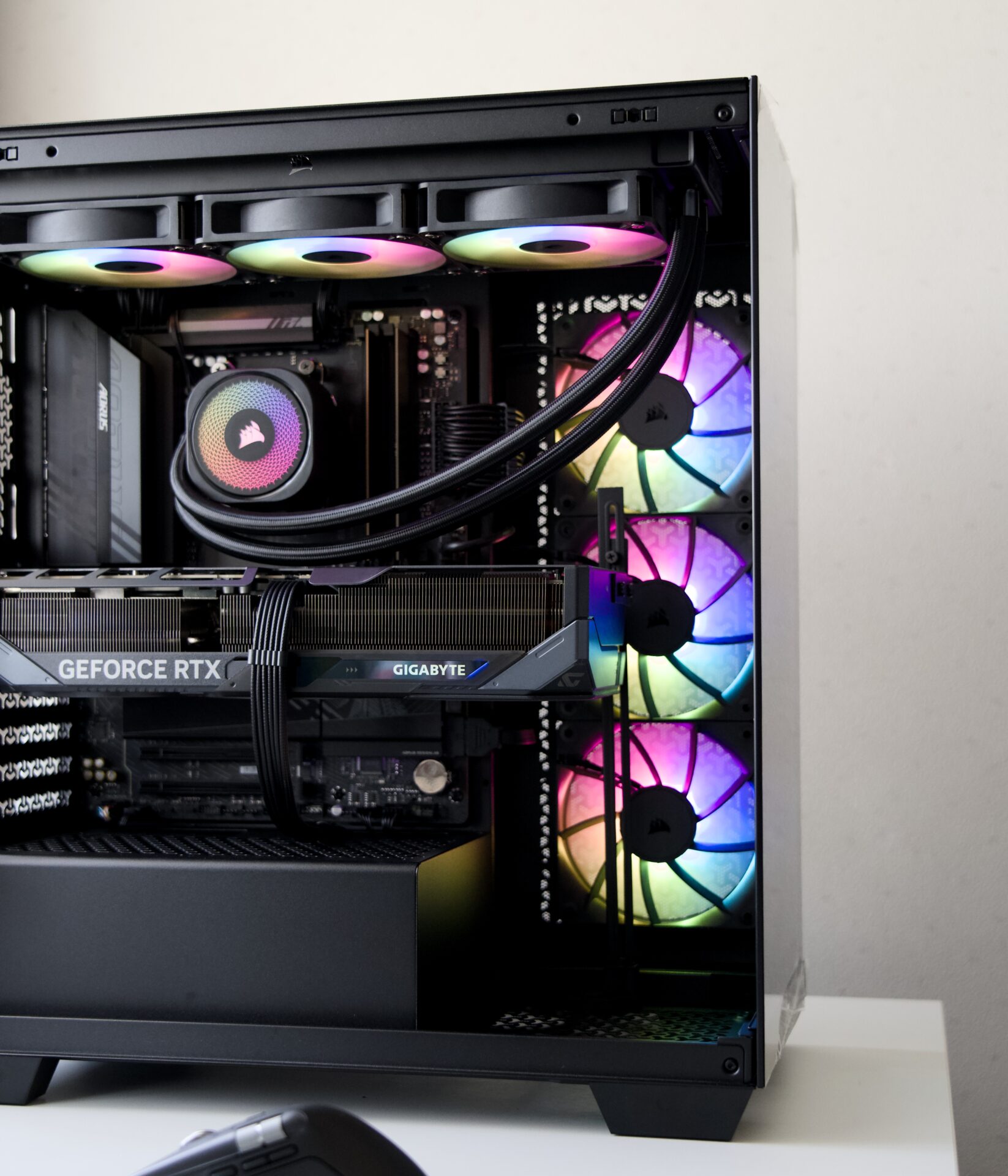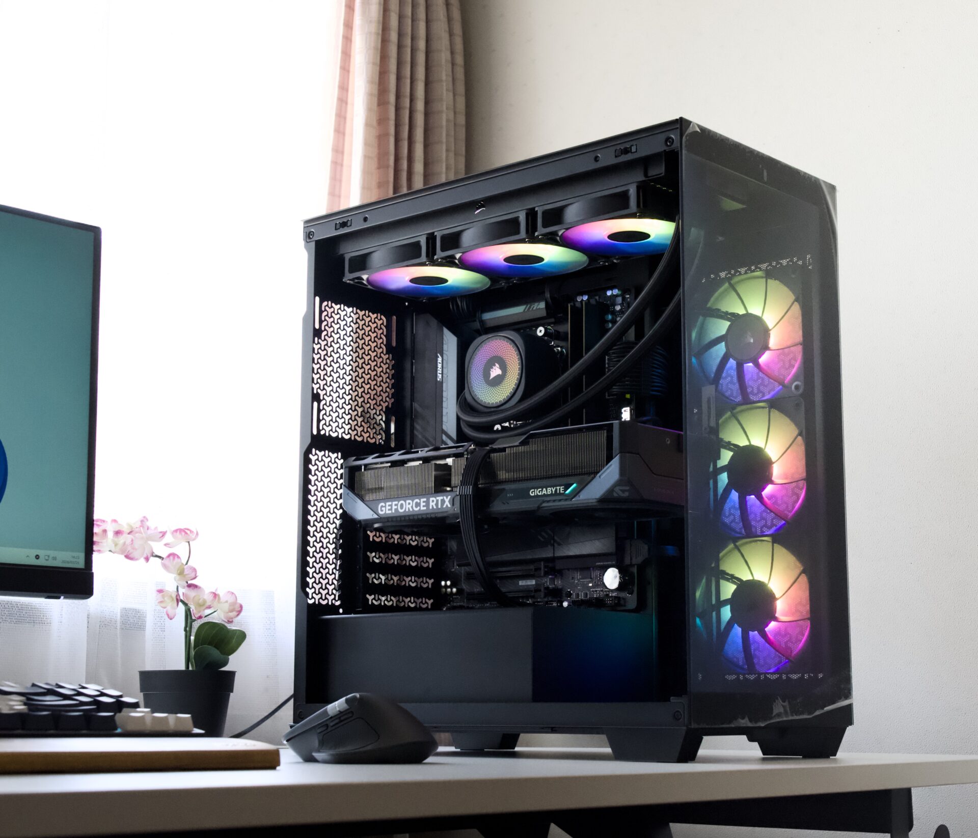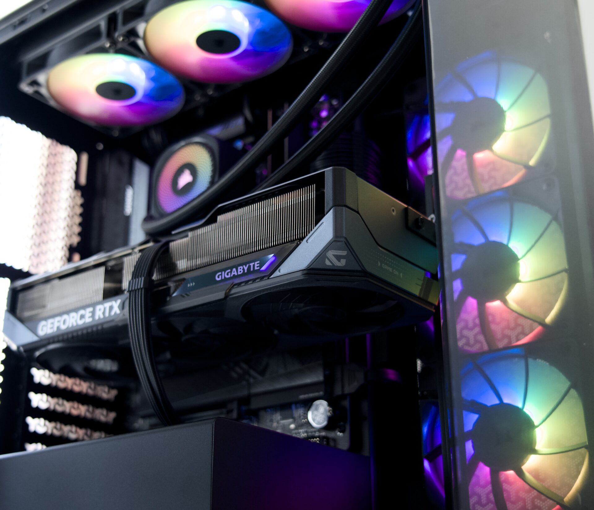 ケース・CPUクーラー・電源はCorsairで統一、マザーボード・グラフィックボードはGigabyteで統一。ARGBファンによるライティングも含めてブラックテーマで統一感のある1台に仕上げました。