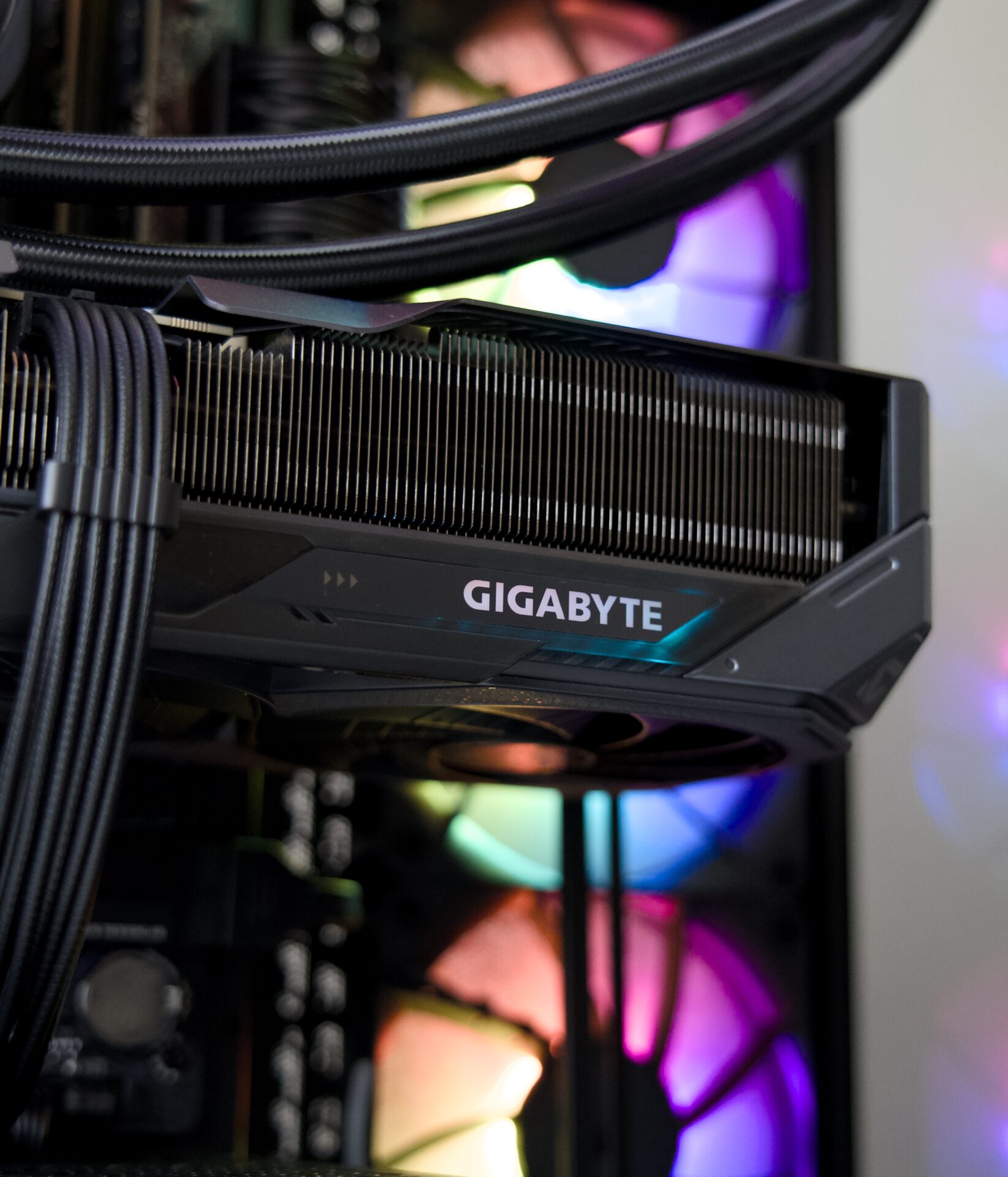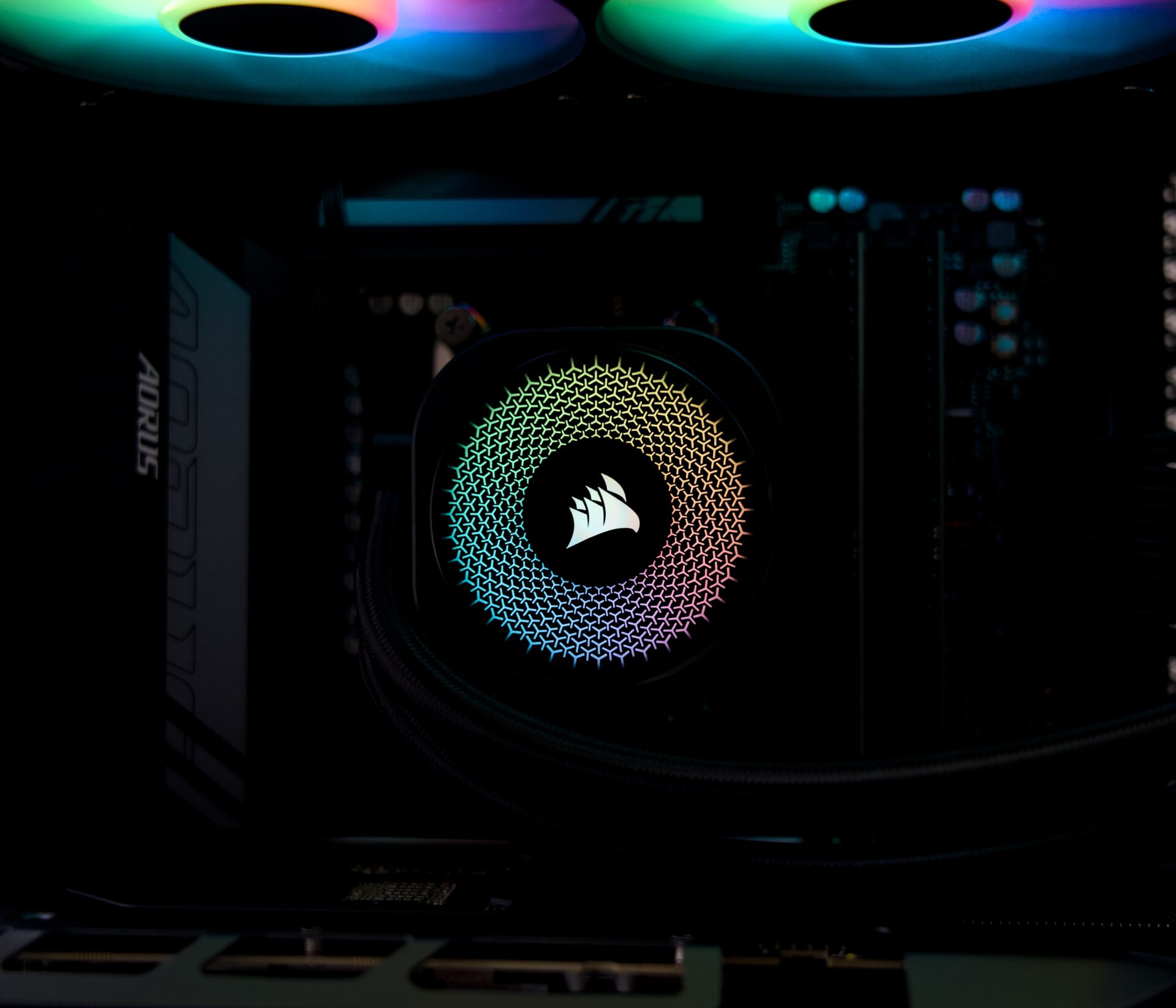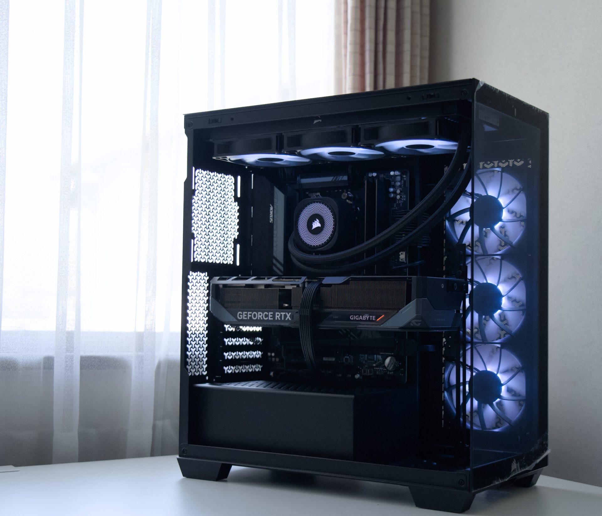 ケース・CPUクーラー・電源はCorsairで統一、マザーボード・グラフィックボードはGigabyteで統一。ARGBファンによるライティングも含めてブラックテーマで統一感のある1台に仕上げました。