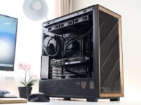 ケース前面には木製の装飾が施されており、インテリアのような仕上がりです。従来のゲーミングPCとは一味違った印象を与えています。光沢のない黒に控えめなゴールド加飾が高級感を引き立てていますね。
